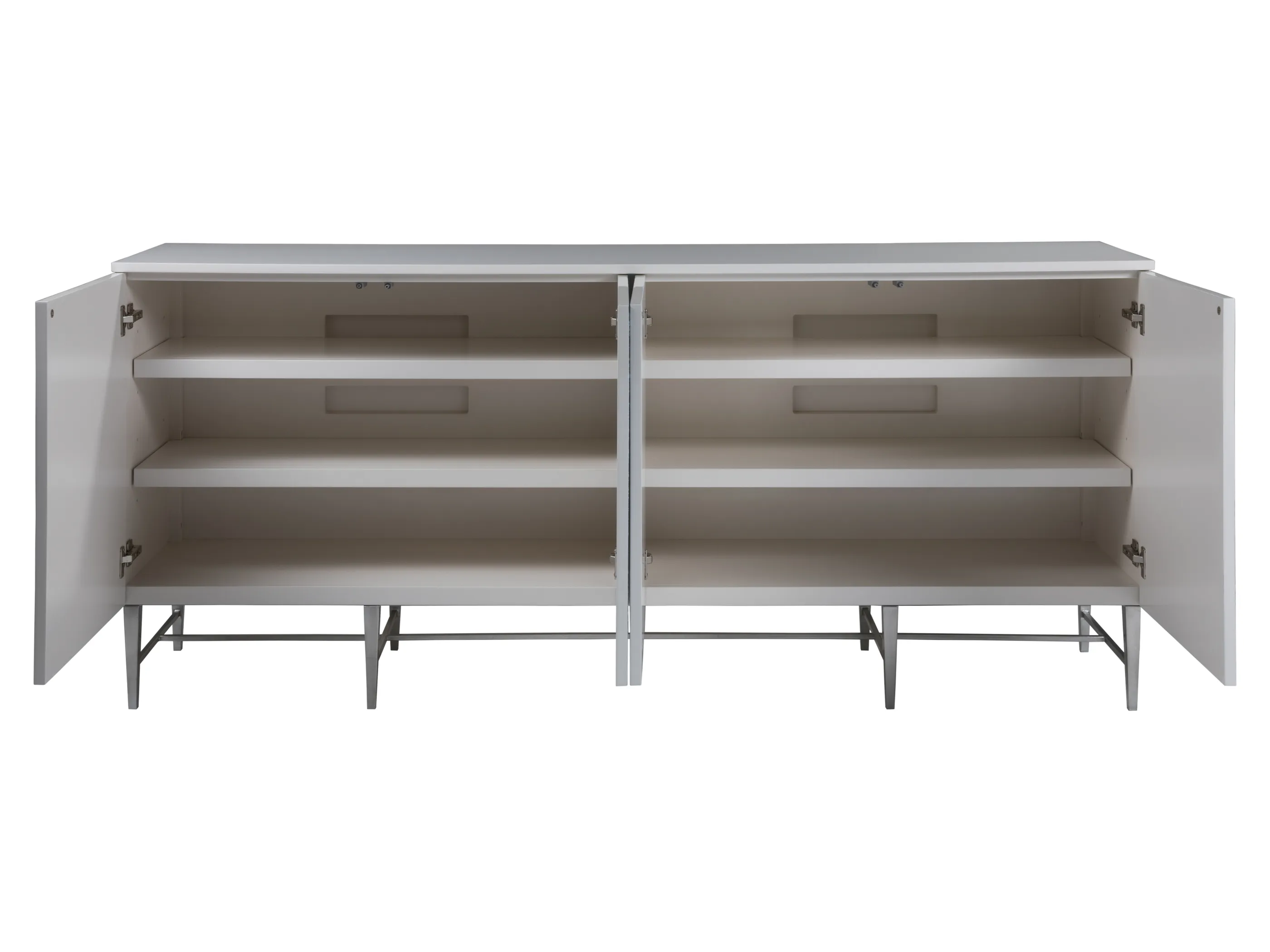 Stately credenza silhouette with door fronts delicately inlaid with bits of eggshell and then subtly colored with dyes and paints by an individual artist. The result is outrageous. Case is finished in a slick ivory and complemented by tapered iron legs and stretchers in silver leaf. Each piece is inlaid and painted by an individual artist and will vary in appearance from piece to piece.