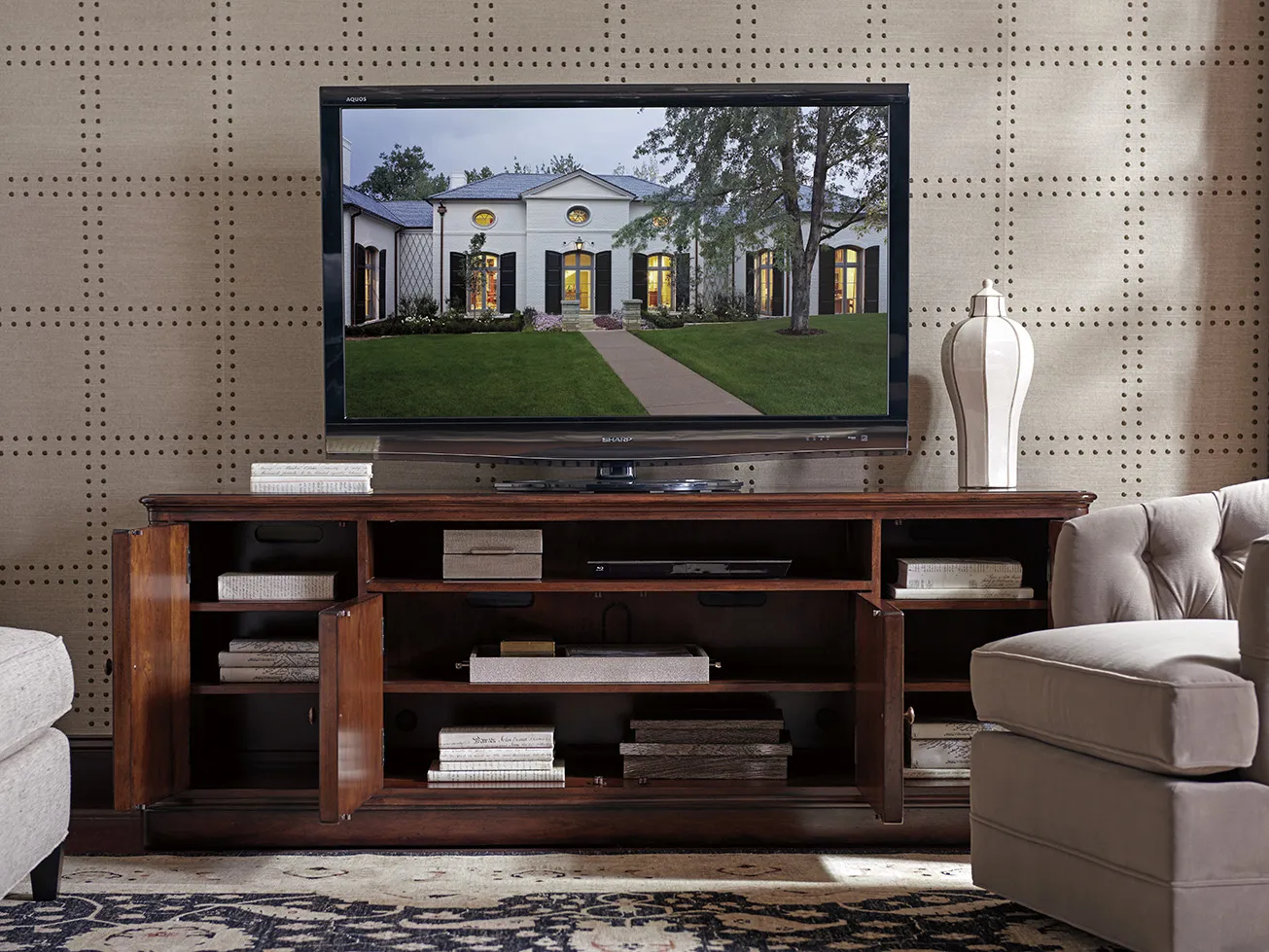 Traditional designs and media function pair well together with an open compartment (41W x 5H) making room for a sound bar, and two doors below with an adjustable shelf for components. The right and left doors open to two adjustable shelves with grommets for wire management and ventilation to provide air circulation for the electronics.