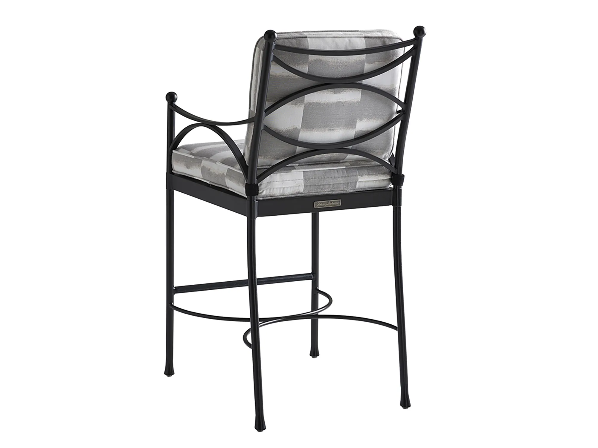 Classic contemporary lines feature graceful intersecting curves on the arms, base and back. Decorative ball finials cap the arms and back of the frame. Designs are crafted from aluminum, in a lightly-textured graphite finish.