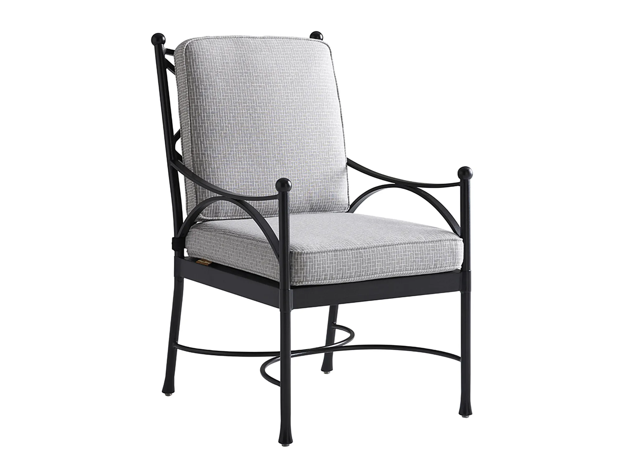 Classic contemporary lines feature graceful intersecting curves on the arms, base and back. Decorative ball finials cap the arms and back of the frame. Designs are crafted from aluminum, in a lightly-textured graphite finish.