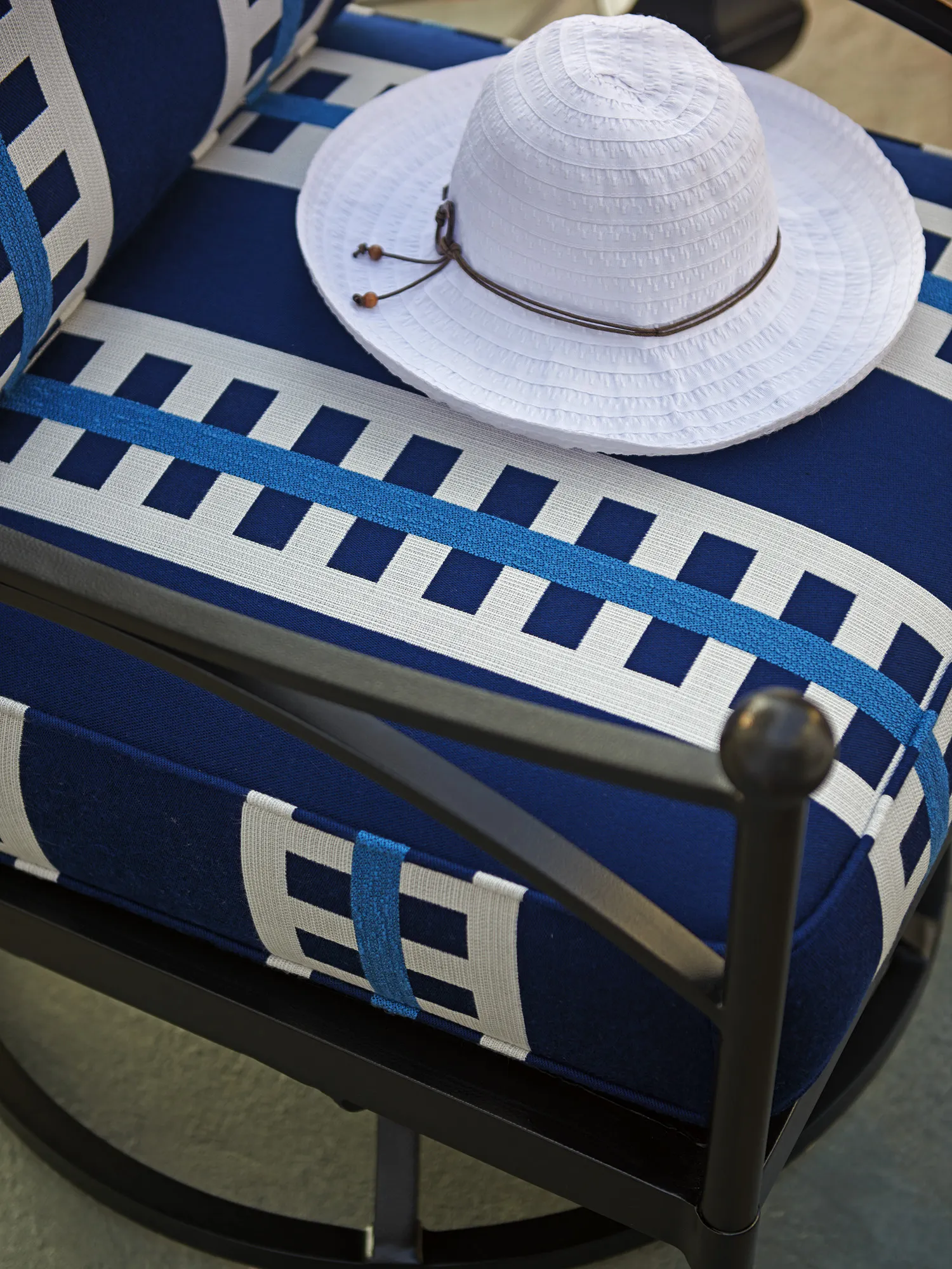 Classic contemporary lines feature graceful intersecting curves on the arms and back, terminated with decorative ball finials. The base features a wide swivel base mechanism to ensure stability. Designs are crafted from aluminum, in a lightly-textured graphite finish.