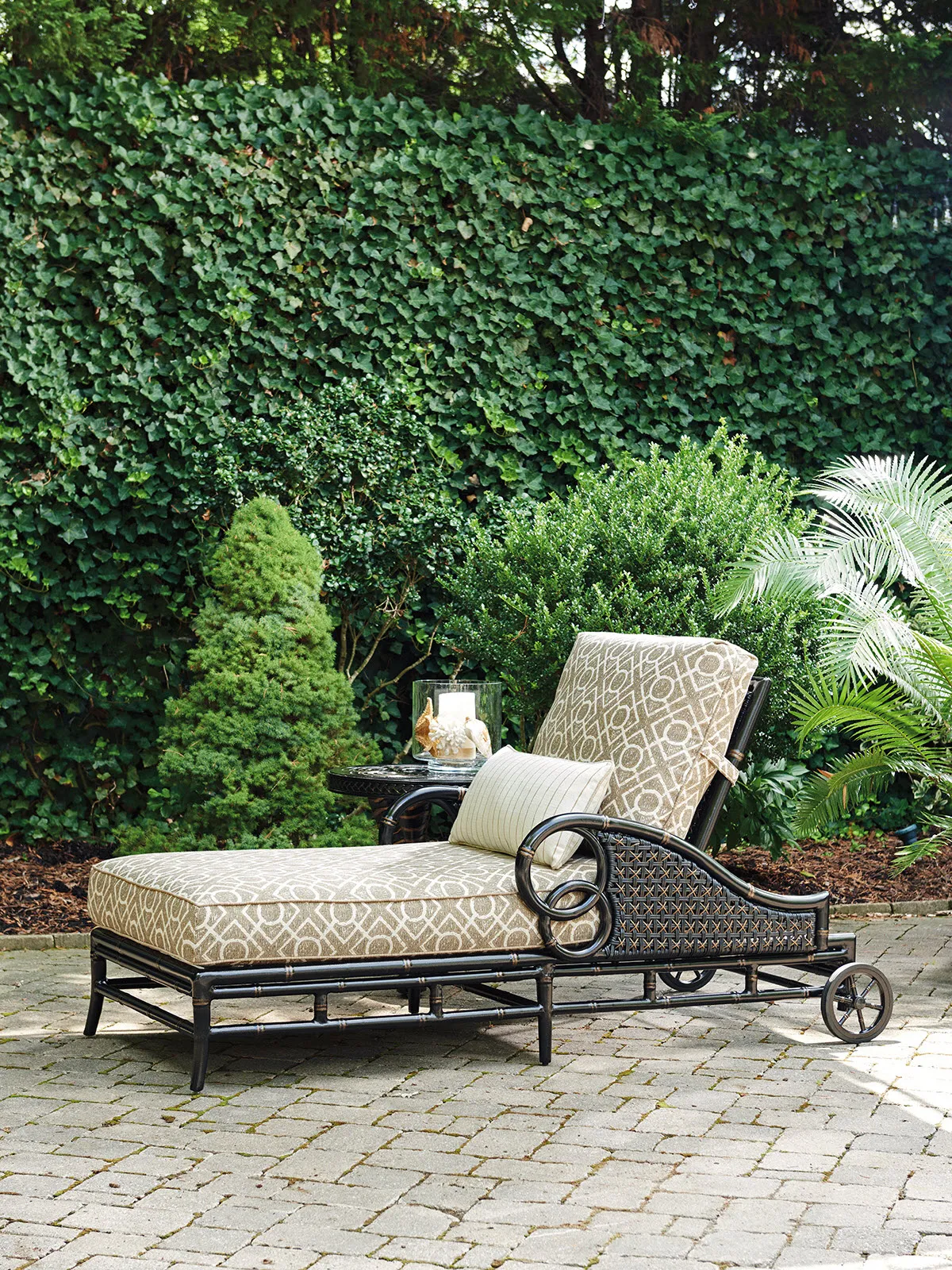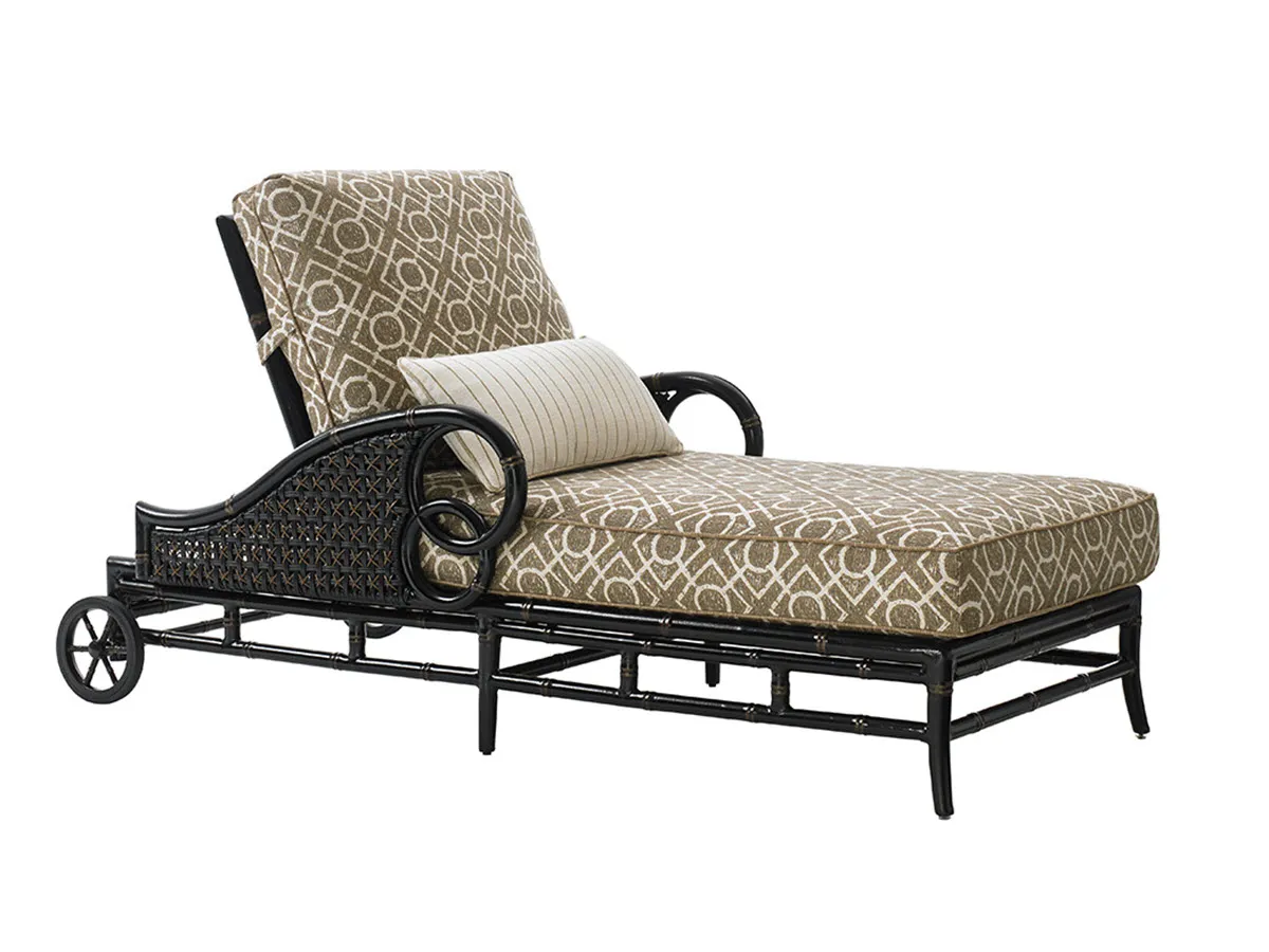 The intersecting rings of the chaise lounge arms beautifully accentuate the soft curve of the all-weather wicker side panel. Accent pillows shown are optional.