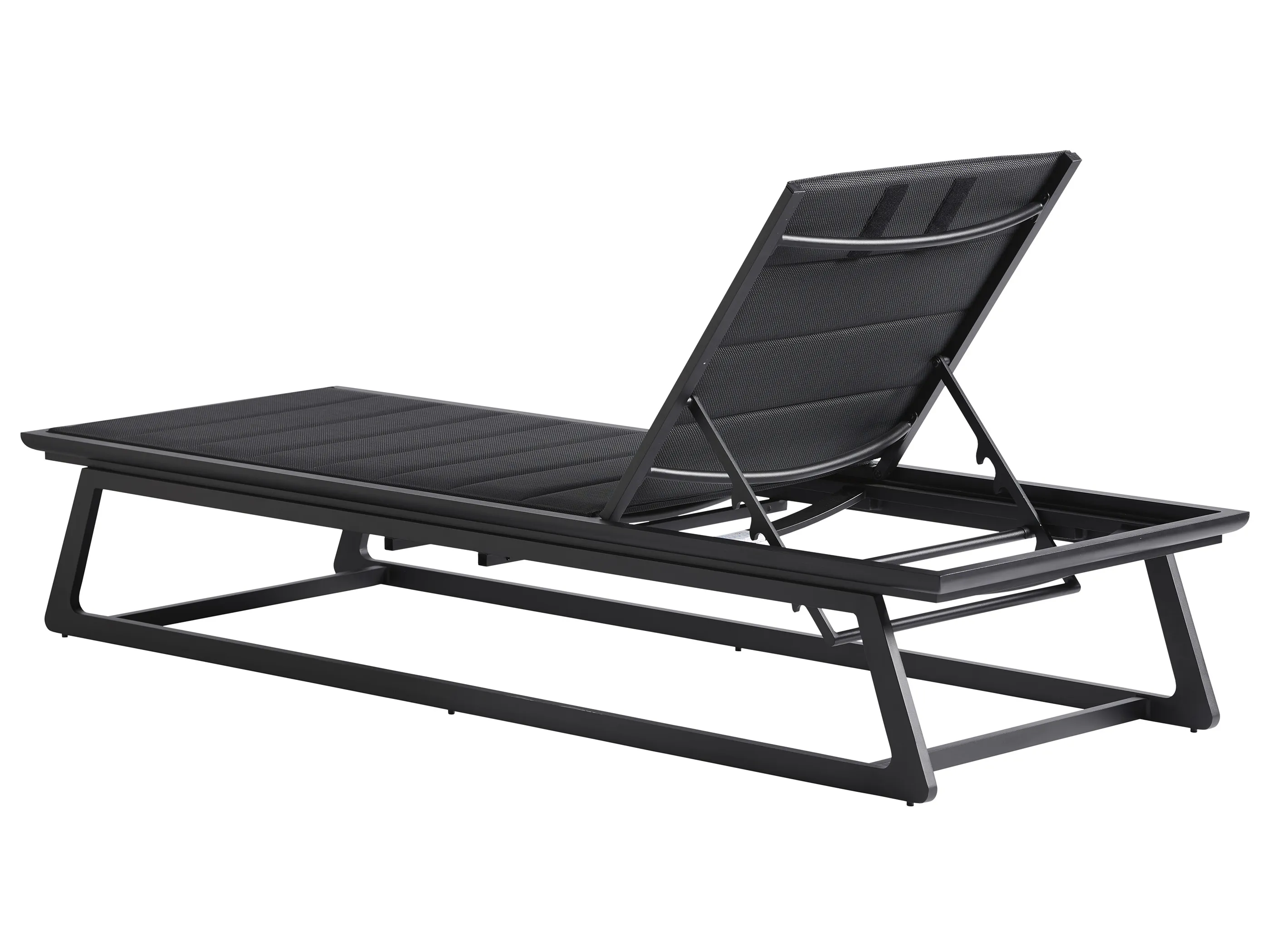 Features premium all-weather channeled sling material on the seating surface with a tab attached head pillow that can flip to the back for sun bathing. The included drink table may sit on the left or right.
