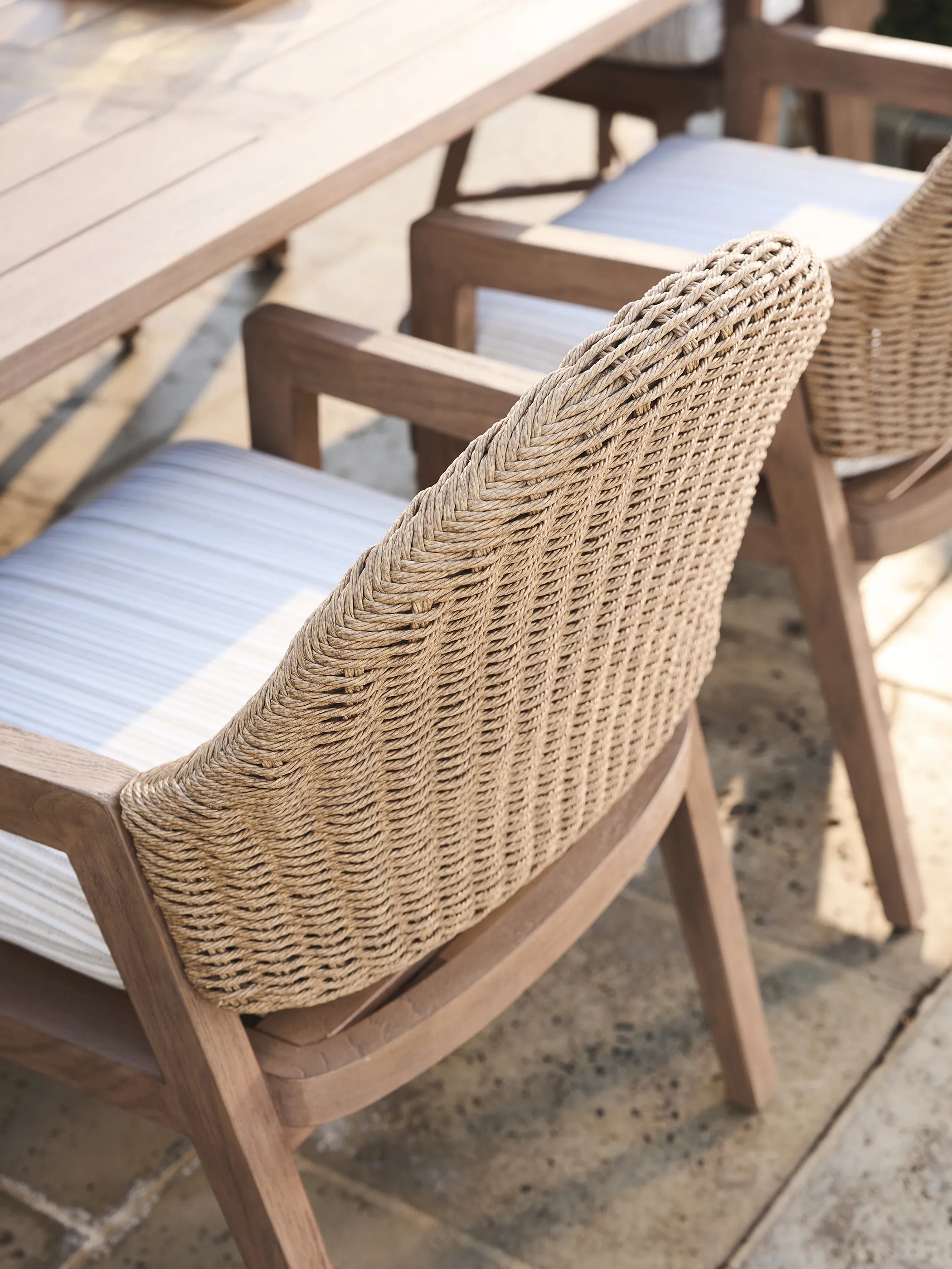 The Isle of Palms dining chair, available exclusively as an arm design, offers a thick, detachable seat cushion and woven inside and outside back.