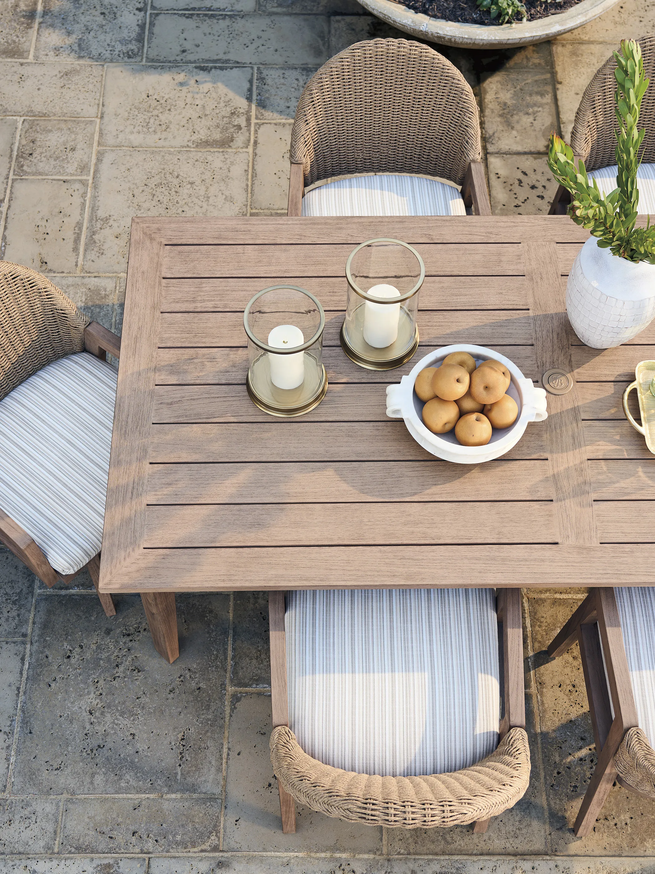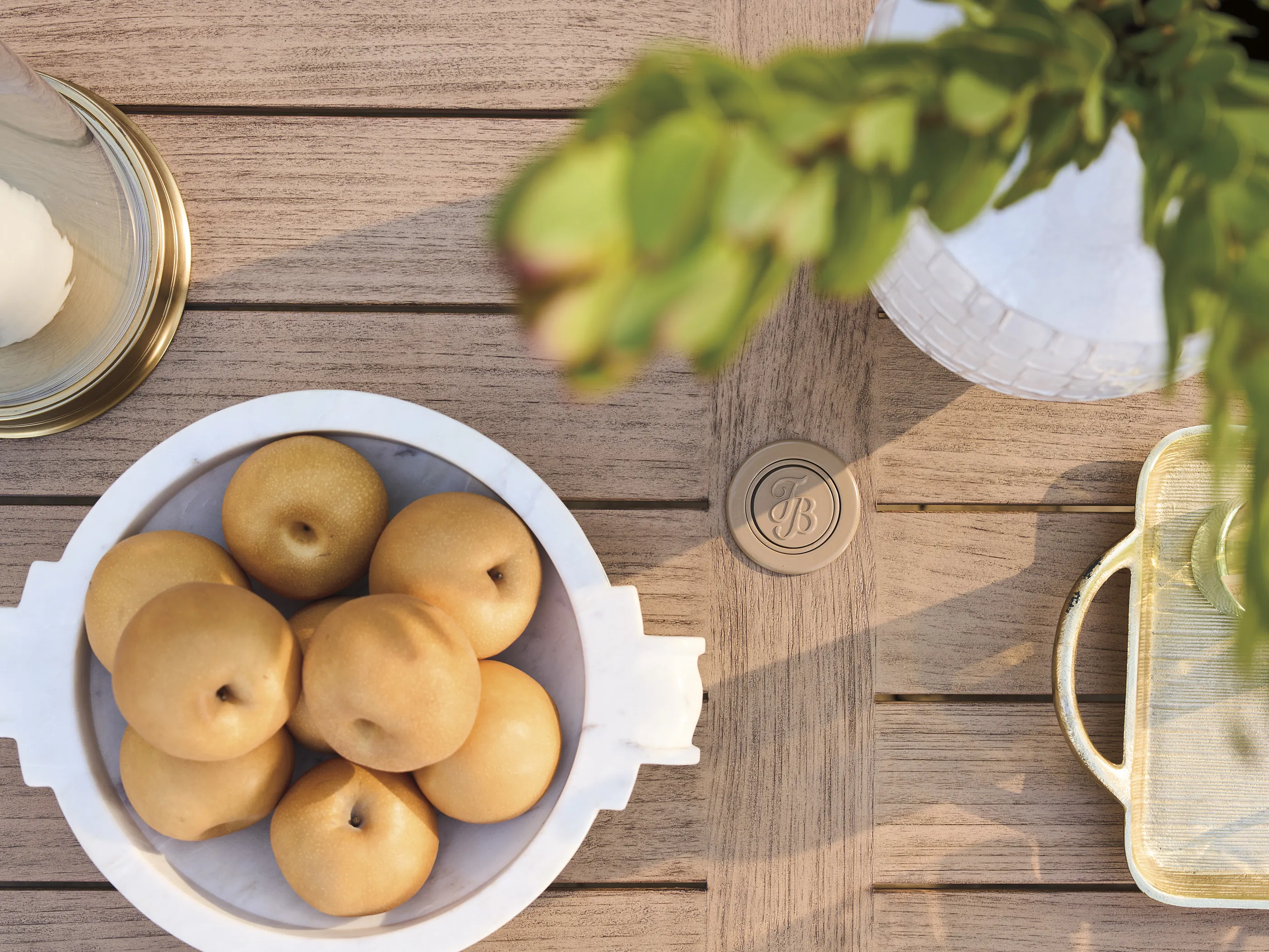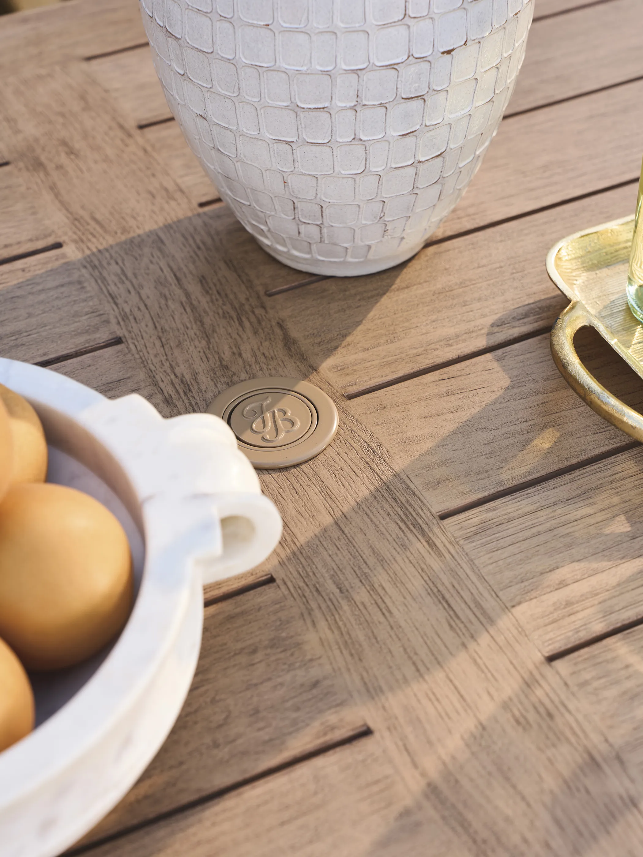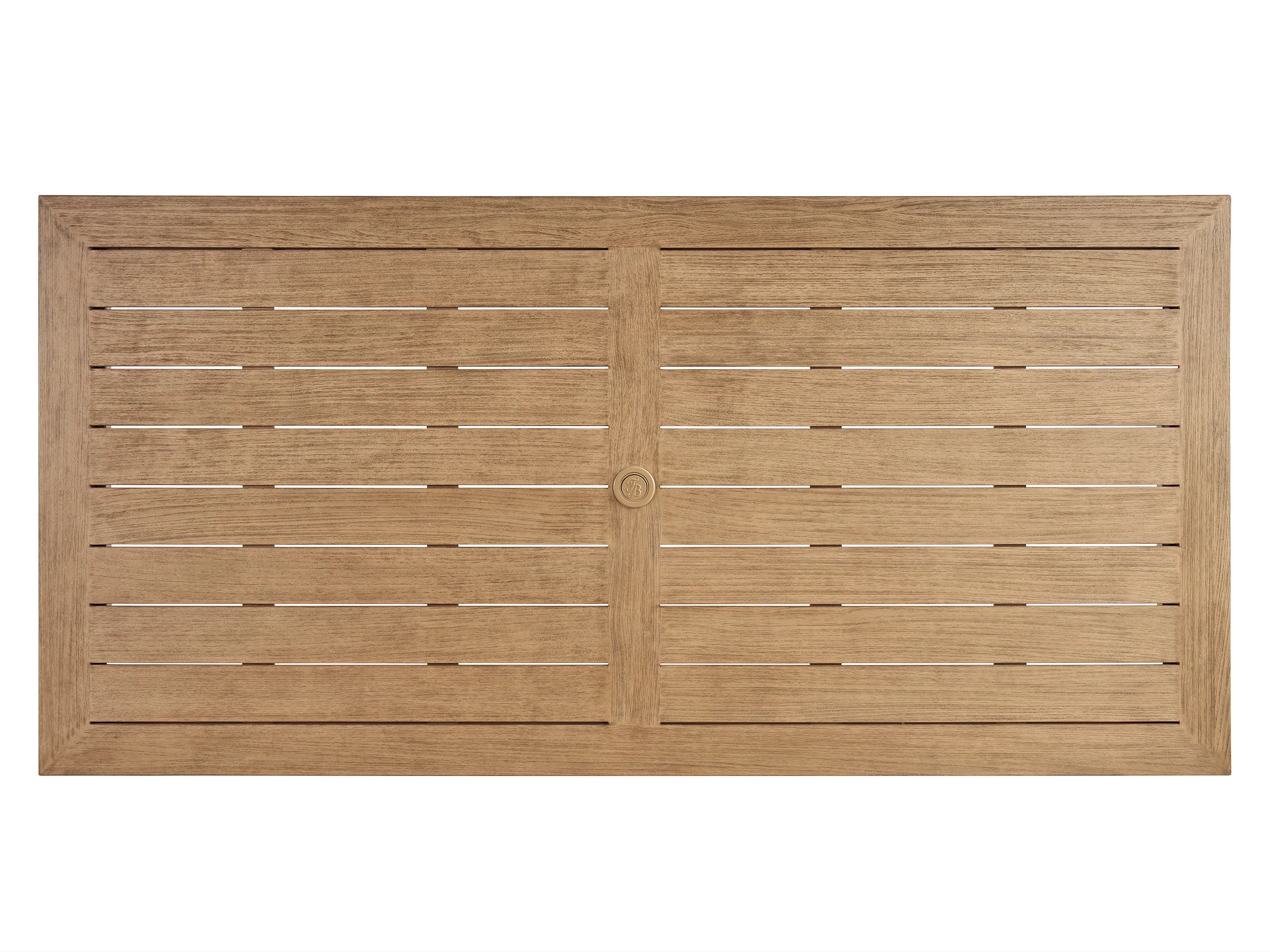 The 91-inch rectangular dining table features a plank top design with mitered border around the perimeter and a pass-through in the middle to accommodate an umbrella. A decorative aluminum insert with a TB monogram is included to conceal the pass-thru when an umbrella is not in use.