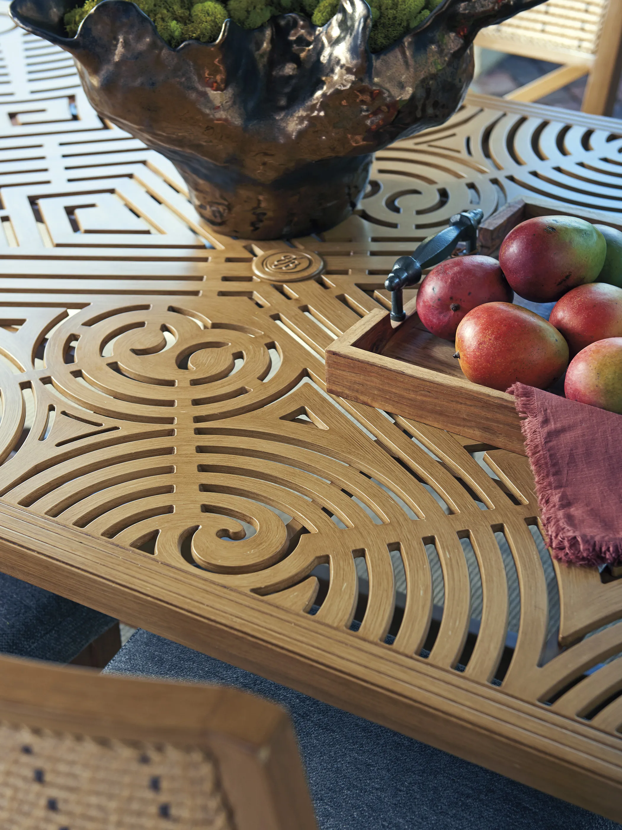 The generous scale of the rectangular dining table accommodates seating for six guests. The Southwest-inspired trestle base sets the tone for the sweeping lines of a pierced aluminum top. The thick apron around the perimetere of the top lends substance to the design. There is an umbrella pass-thru in the middle of the table. Consists of 3930-877AT and 3930-877TB.