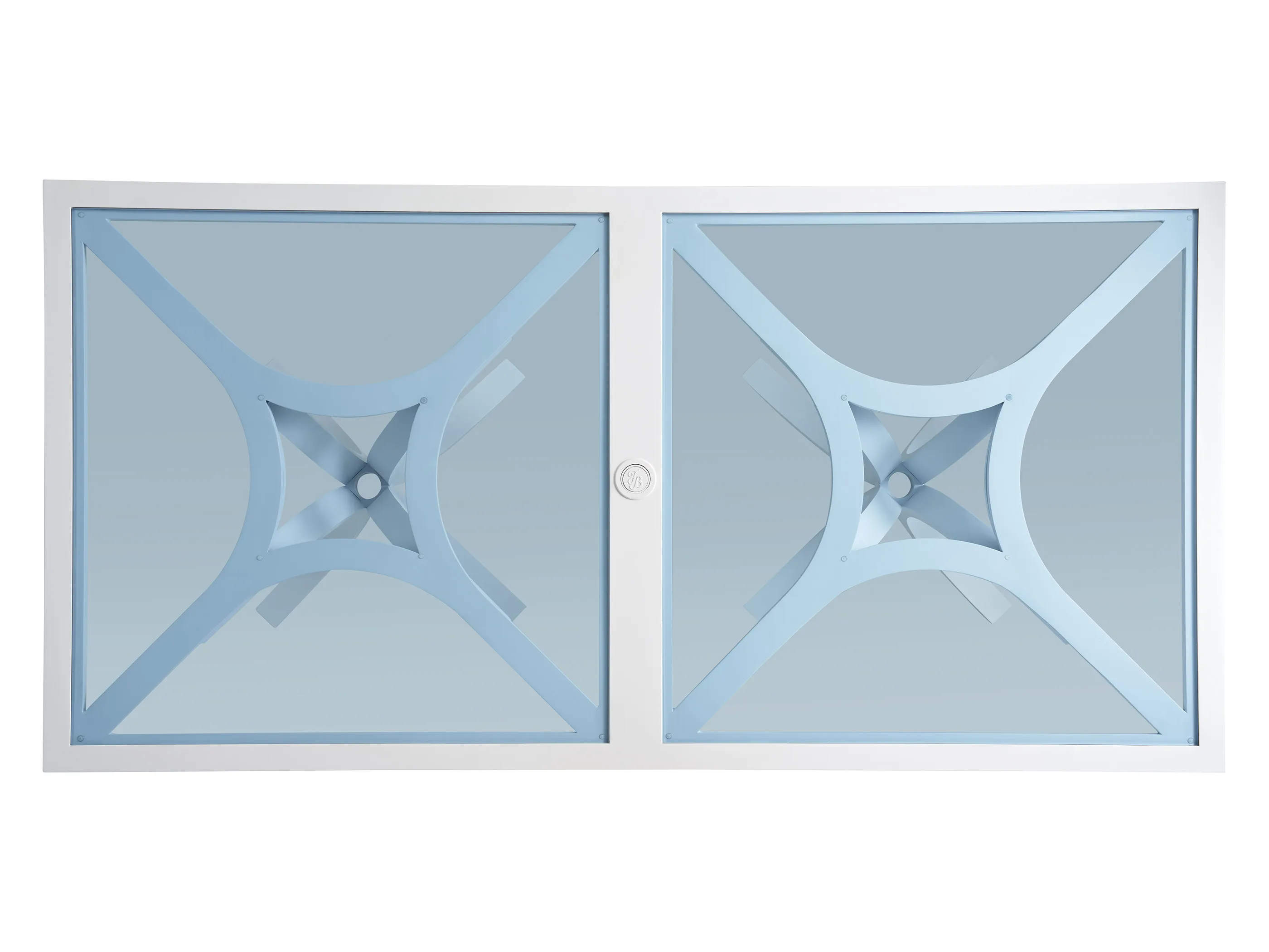 The rectangular dining table features twin pedestals with umbrella pass-through at table center. The removable TB monogram disk is an attractive detail if an umbrella is not added. The dining set will comfortably seat eight.