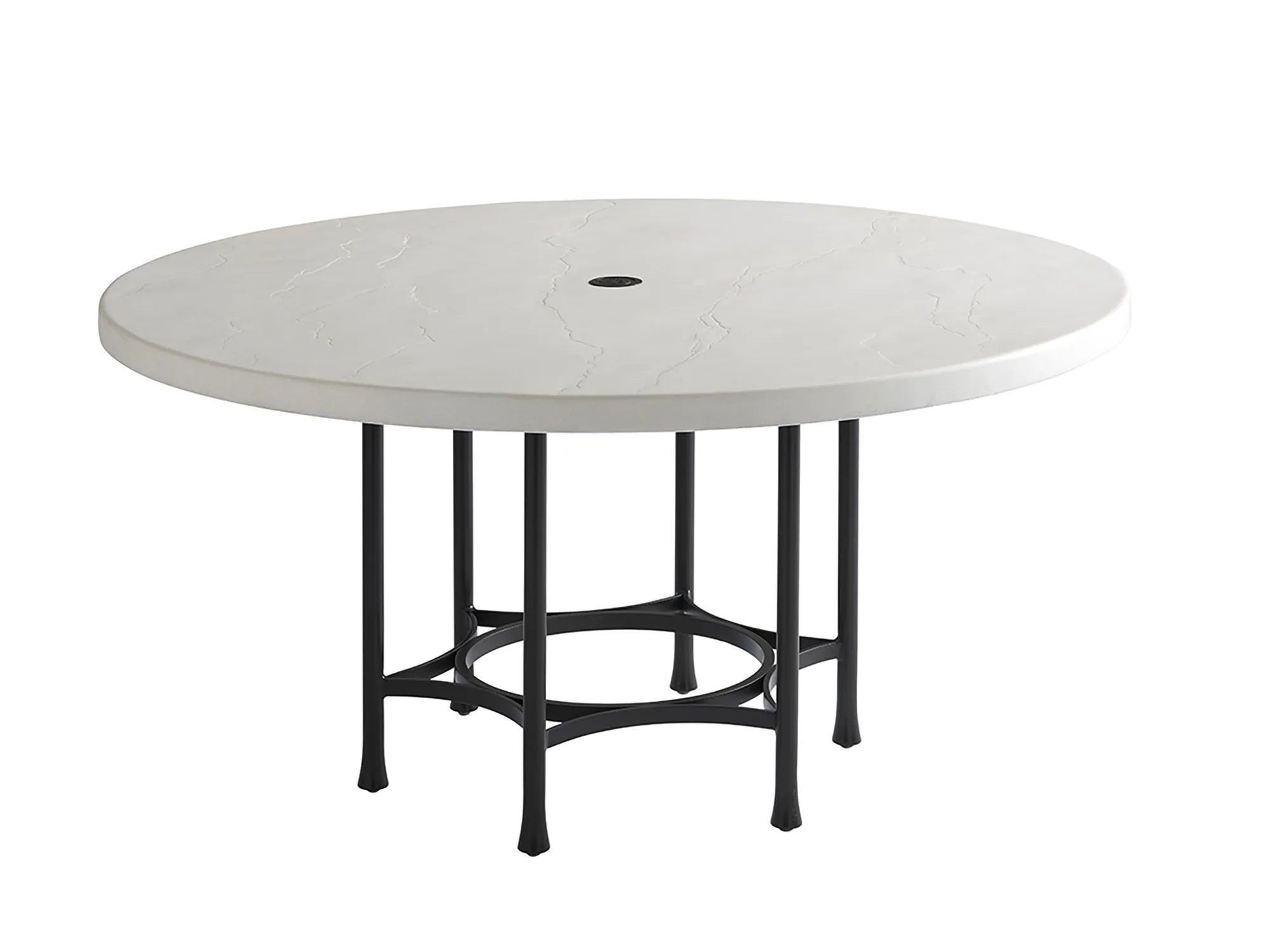 The hexagonal base features clean architectural lines and stretchers to each of the six contemporary flared legs in a sophisticated, lightly textured graphic finish. The durable all-weather top emulates the look and feel of honed natural limestone, in a soft ivory coloration, for a classic look and has a center removable monogrammed button for an additional umbrella, sold separately. Consists of 3910-870FS abd 3910-870TB.