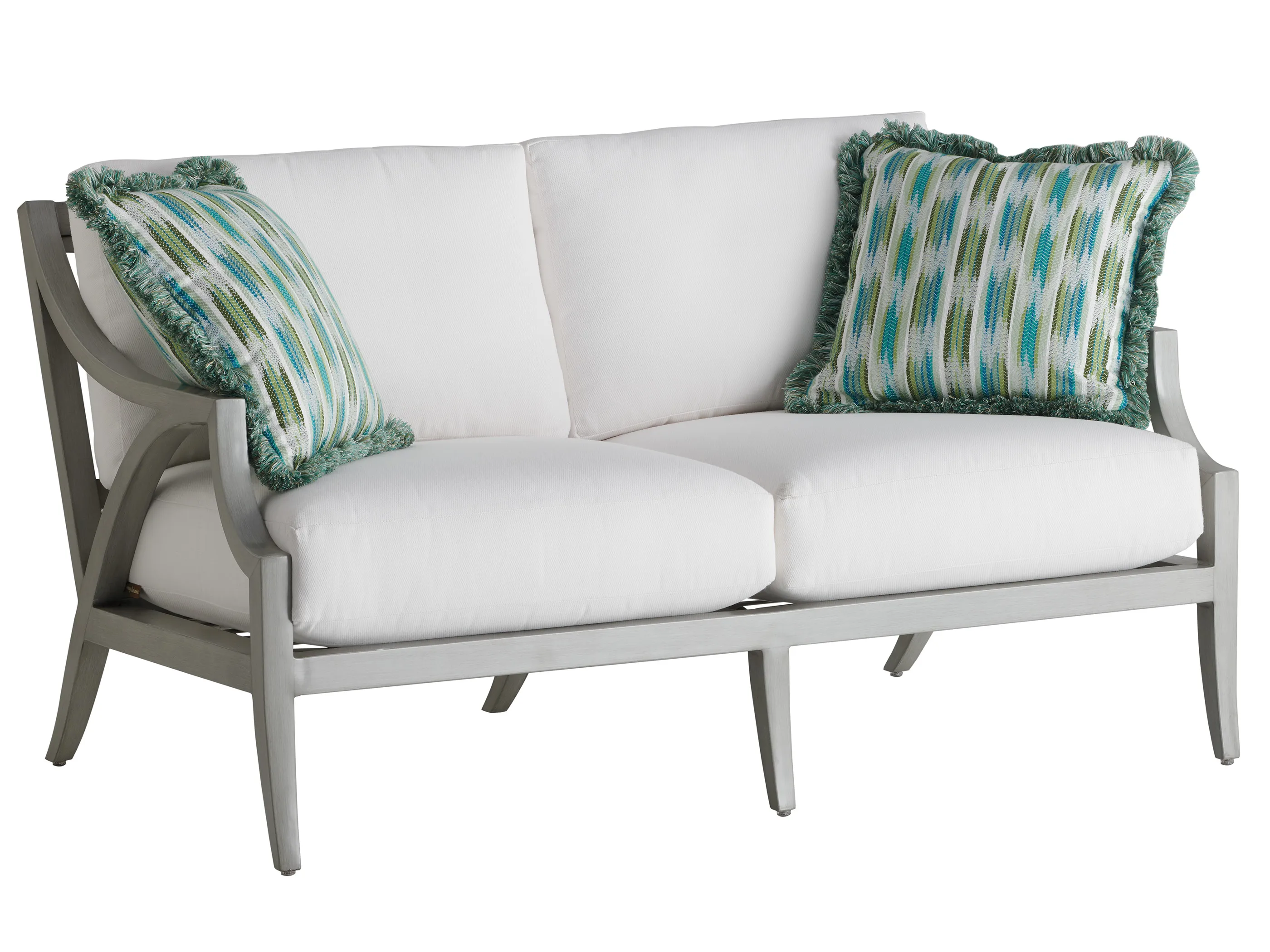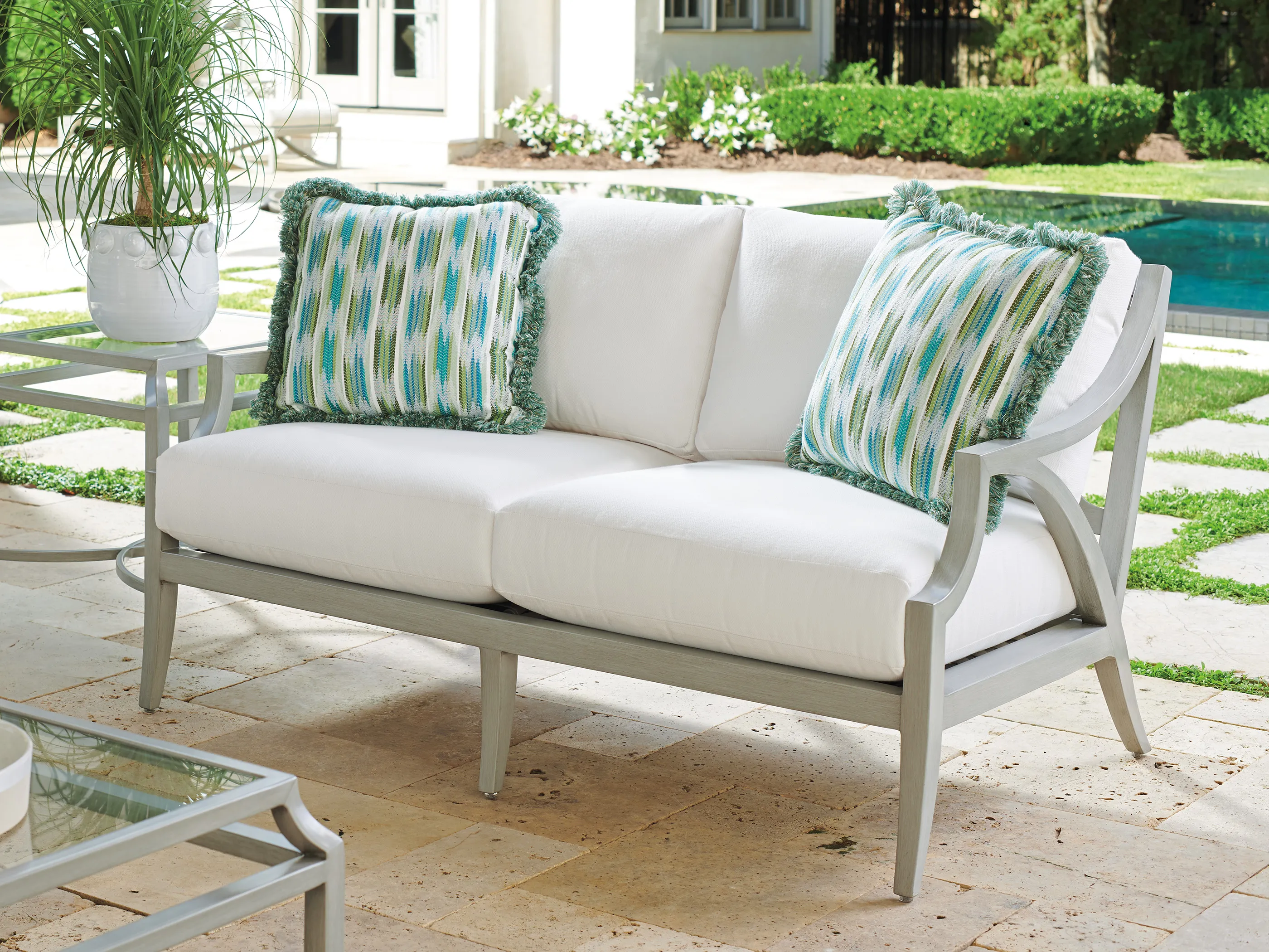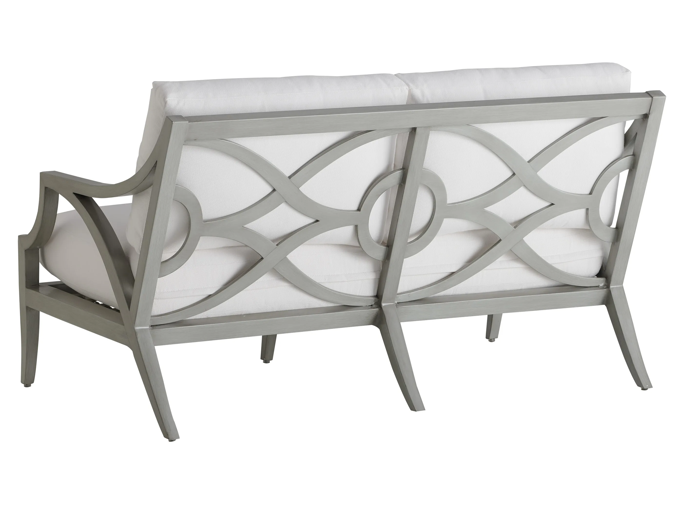 In order to accommodate outdoor spaces of any size, Silver Sands offers an 88-inch sofa design as well as a 60-inch companion love seat. Both feature sweeping lines on the arms and an interlocking fretwork pattern on the back. Accent pillows shown are optional.