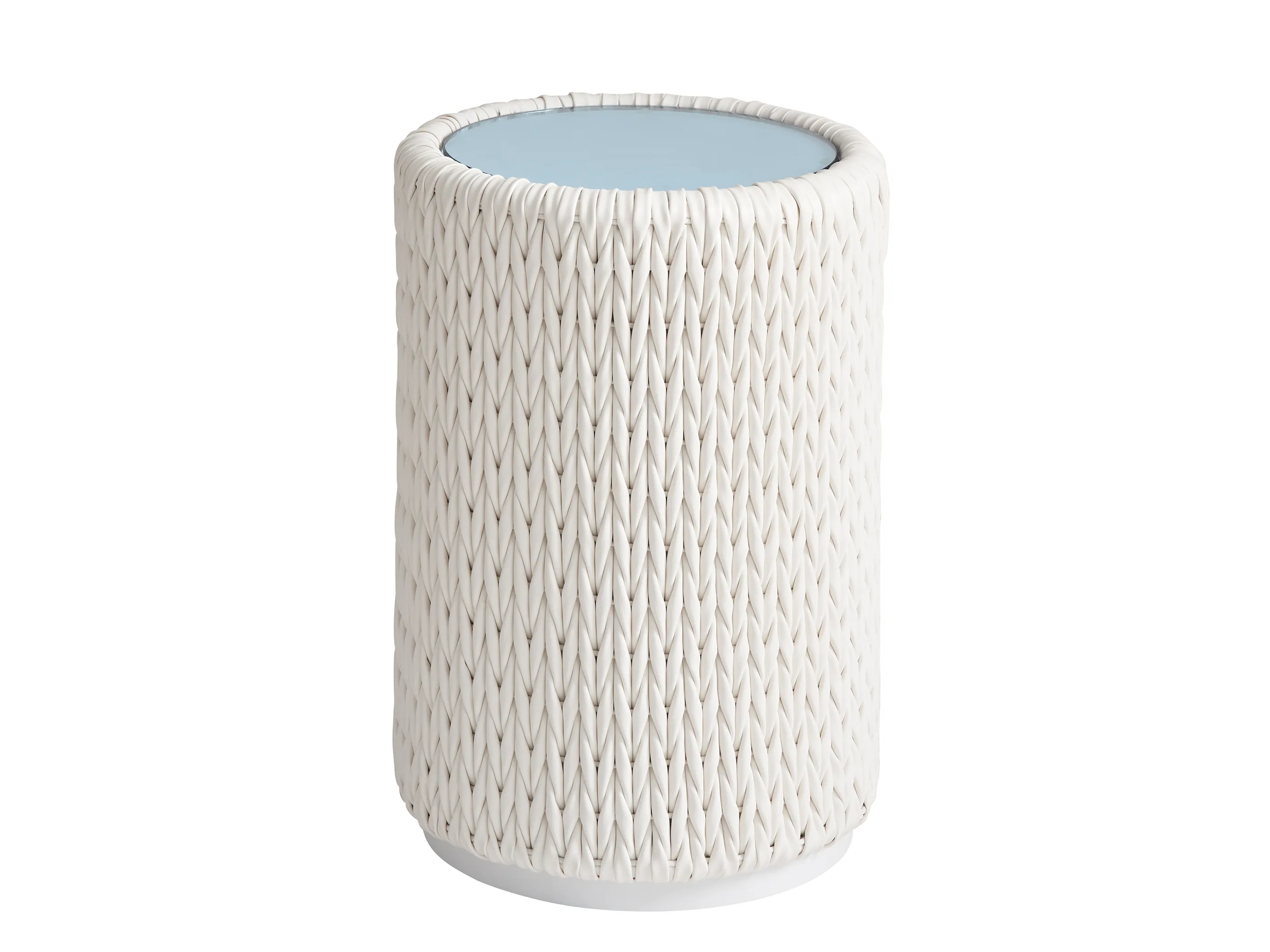 The 15-inch diameter accent table is perfect for dirinks, with a glass top and plinth base.
