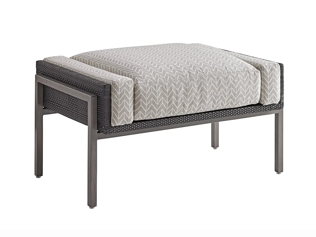 An architectural cast aluminum frame, finished in platinum gray, supports a woven cradle in a contrasting charcoal coloration, giving the appearance of a floating foot rest.