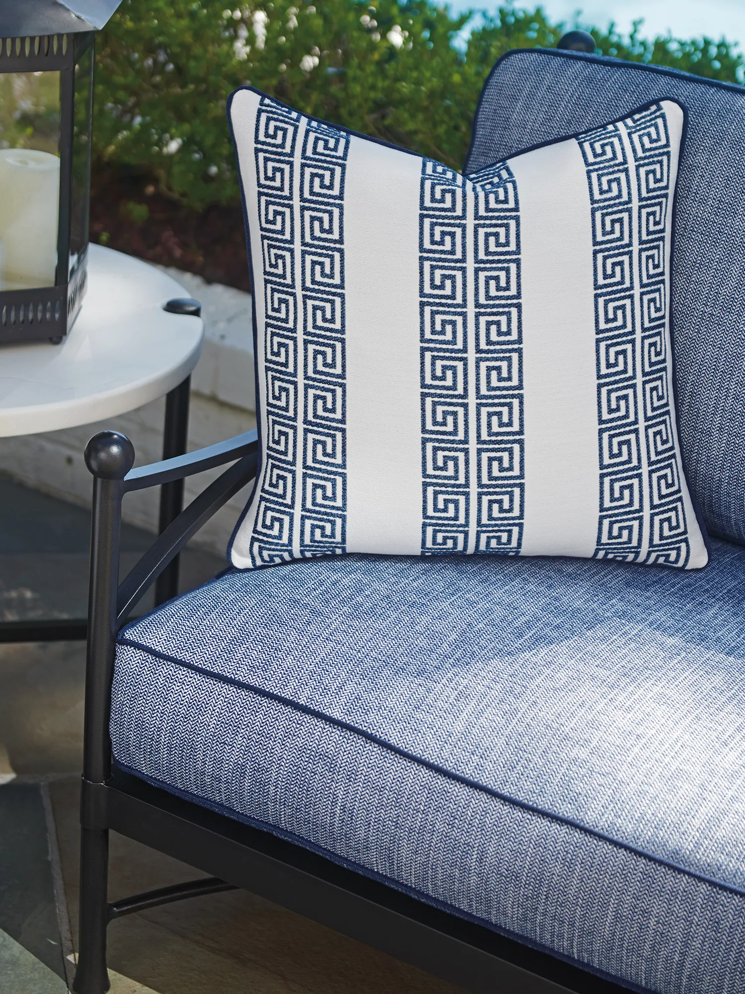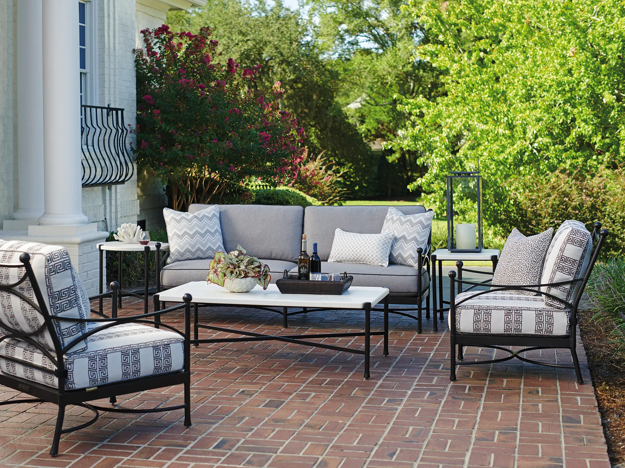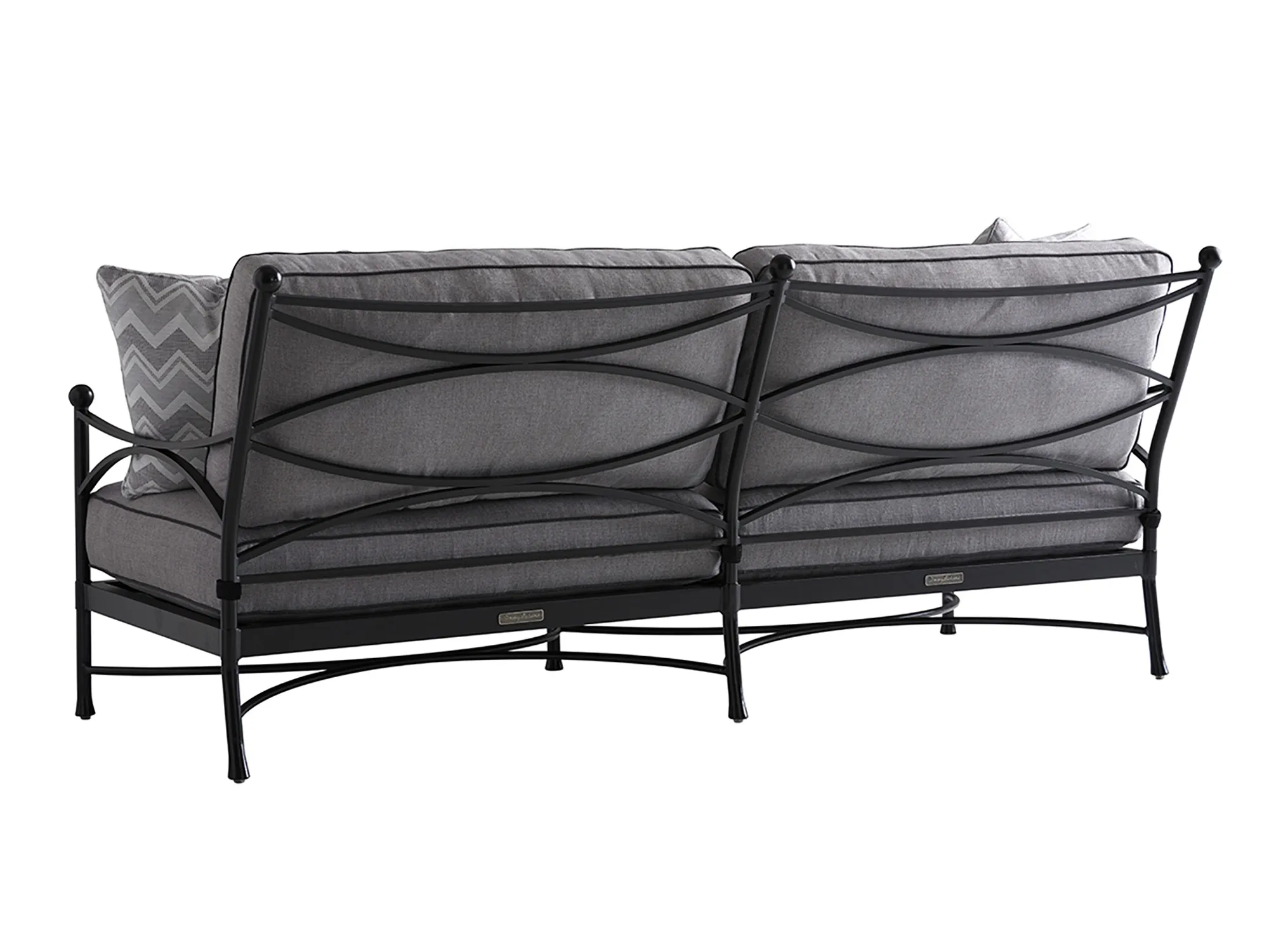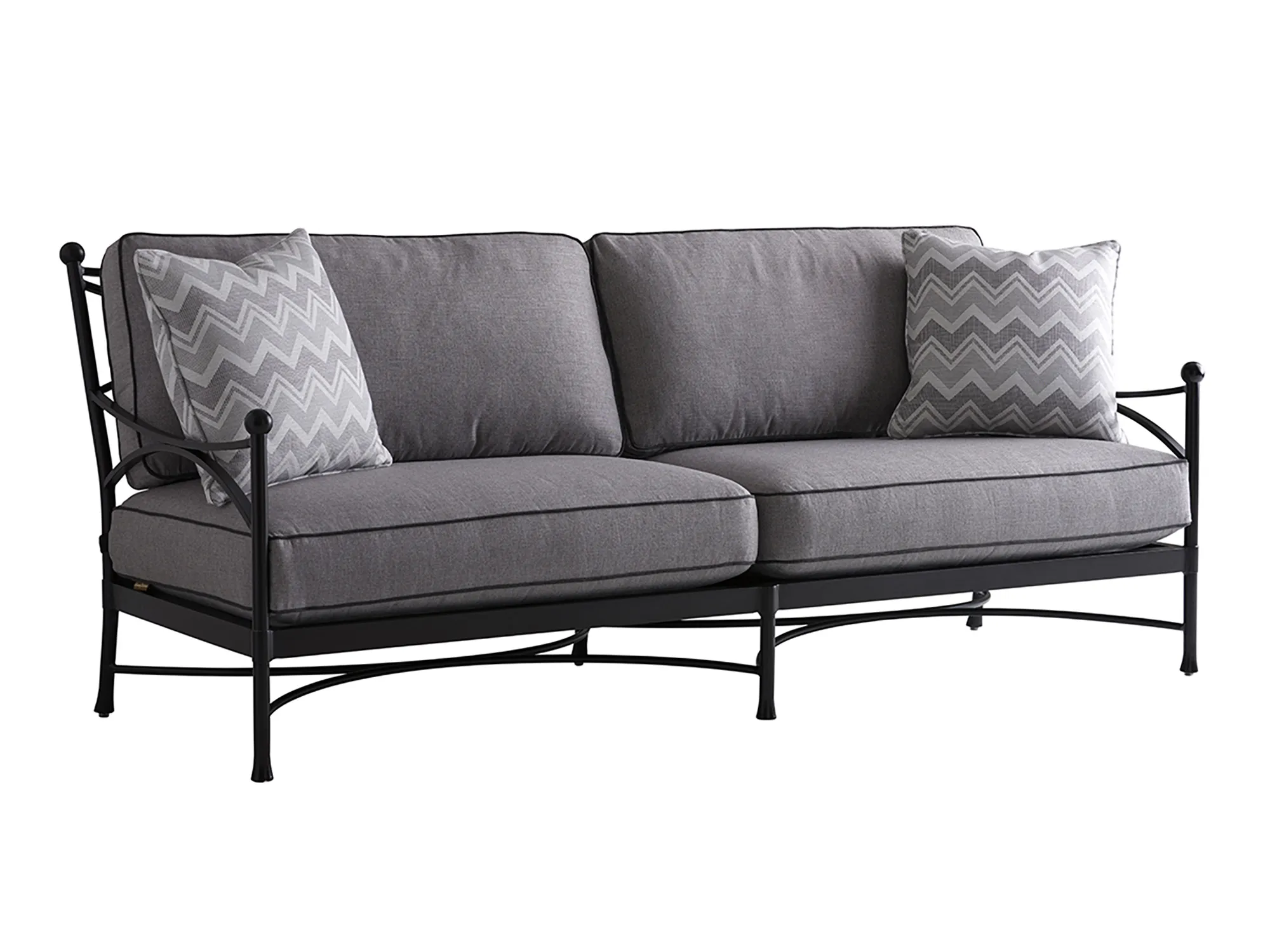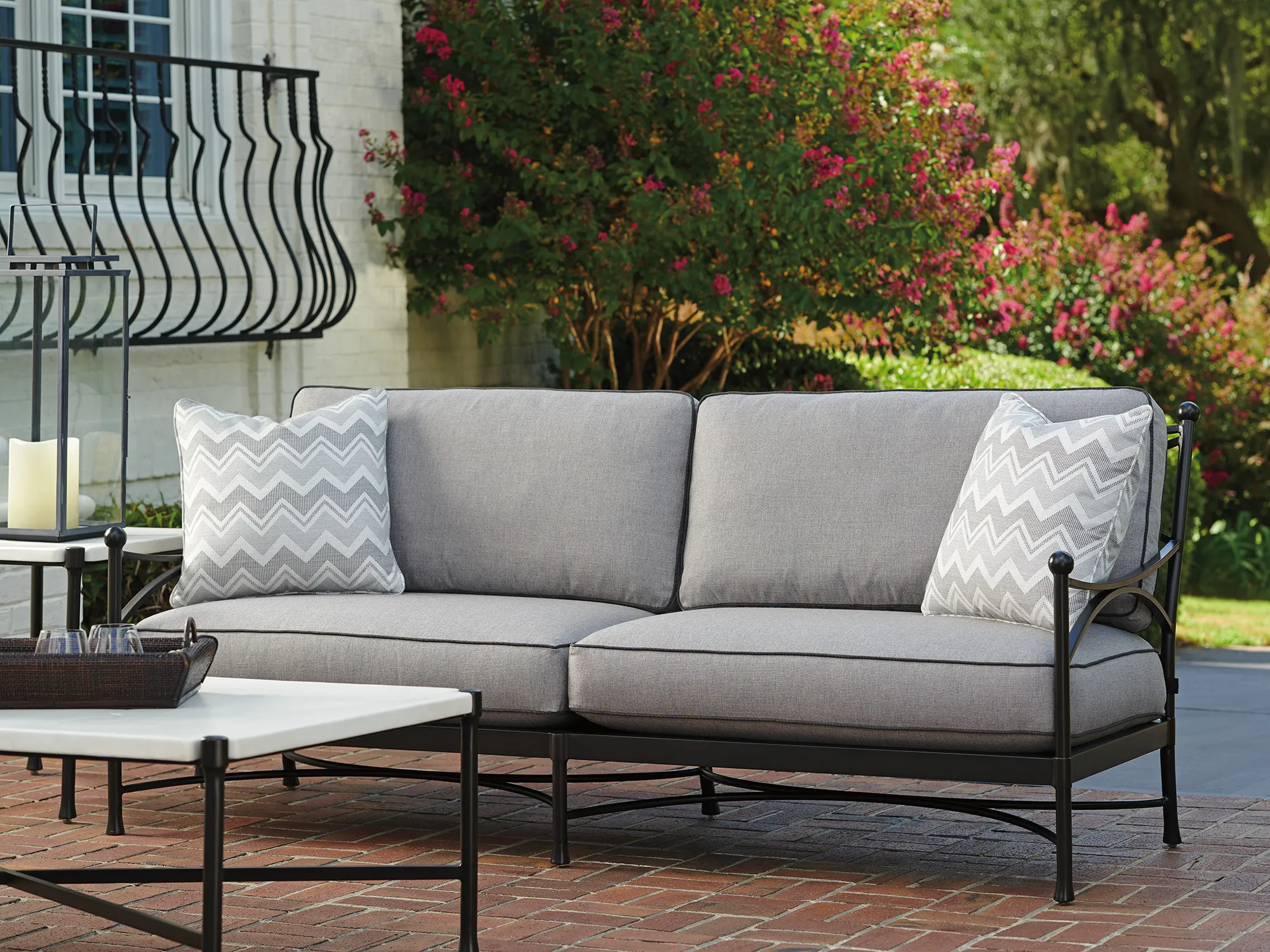 Classic contemporary lines feature graceful intersecting curves on the arms, base and back. Decorative ball finials cap the arms and back of the frame. Designs are crafted from aluminum, in a lightly-textured graphite finish. Accent pilllows shown are optional.
